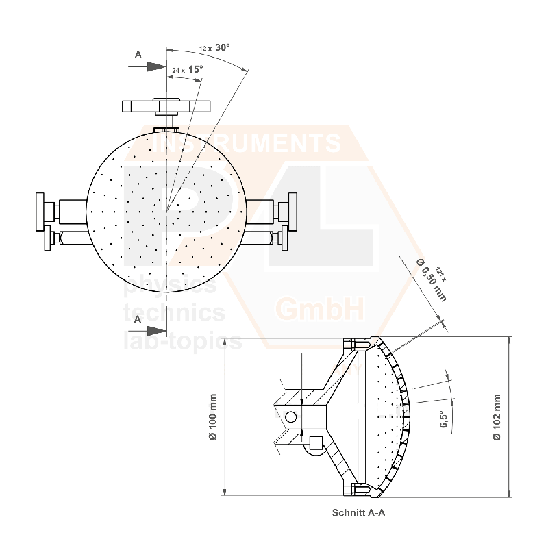 - 淋浴喷头,外径102毫米,半径75.5毫米,有121个直径0.5毫米的开口,两件式,可拆卸清洗和除垢